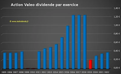 C'est aussi la troisième année consécutive que le dividende est augmenté pour Valeo. Cependant, le dividende actuel de 0,38 € ne représente encore qu'une fraction du dividende record de 1,25 € brut par action versé il y a cinq ans avant le COVID-19. Valeo l'a fait trois années de suite entre les exercices comptables 2016 et 2018.